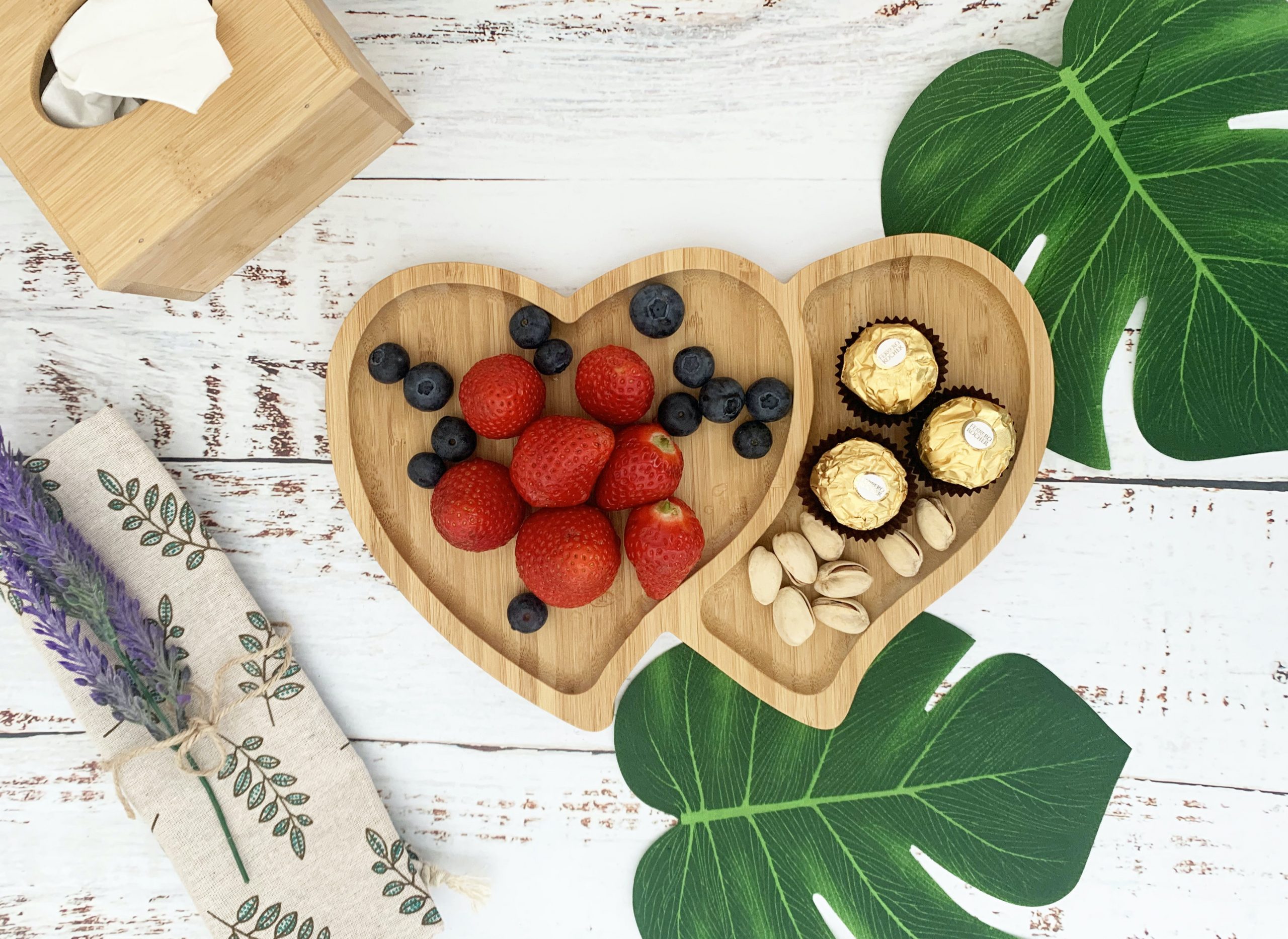 Crafted from sustainable harvested bamboo, this beautiful double heart-shaped bamboo wooden serving platter is stylish and eco-friendly, making it the perfect addition to your home. Made from premium bamboo, this heart-shaped serving tray is exceptionally durable and moisture-resistant, ensuring supreme longevity in any fast-paced household. The bamboo construction also gives this platter/tray an extremely luxurious and elegant look, ensuring you always serve in style to truly wow your guests. Designed with two separate compartment, this small tray/platter can be used to present your combination of creativity. Try serving, as an example, a sweet Valentine's Day dessert or a piece of tart with a special gift on this double heart-shaped platter. Just wait and see: the message will be understood! It makes the perfect Housewarming Gifts, Christmas gifts & Mother's Day Gifts.